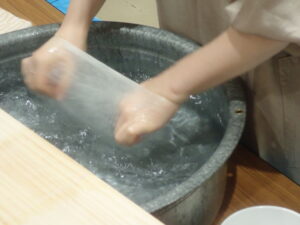 水中で繭を広げて袋真綿を作る工程をご覧いただけます。