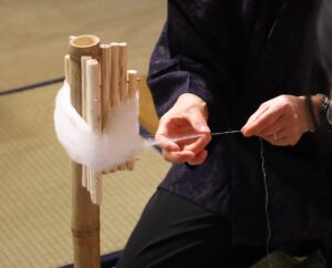 結城紬の手つむぎ技法により、まわたを引き伸ばし、「つくし」という道具を使って糸を作る工程をご覧いただけます。
